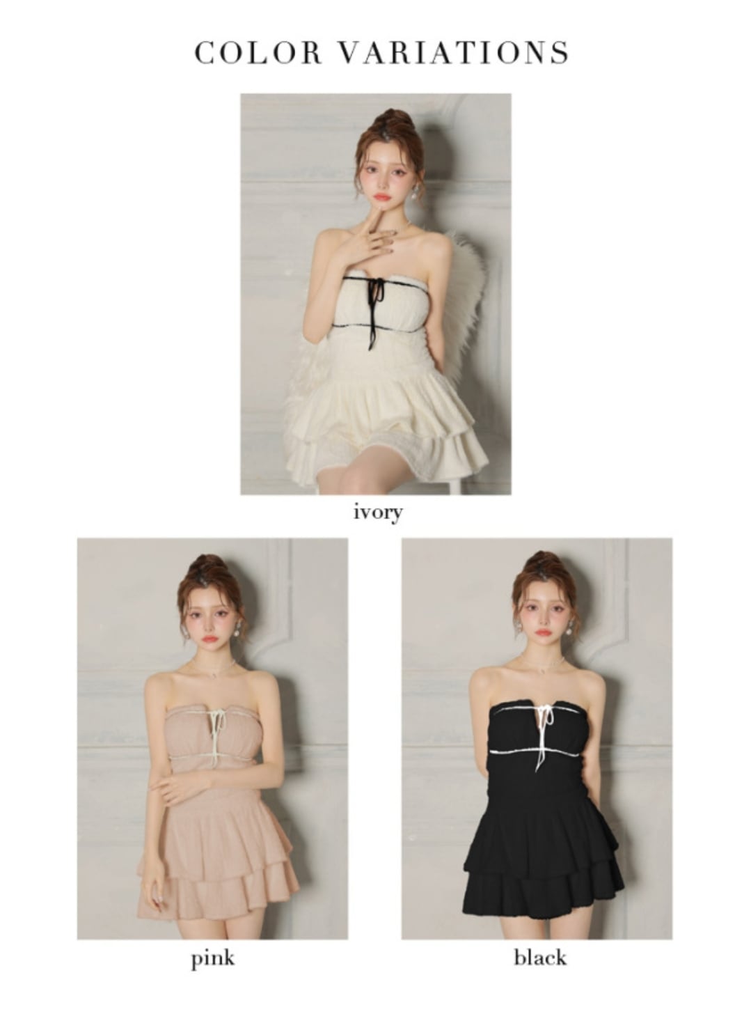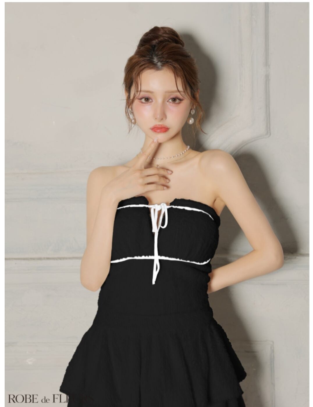 トップスはシンプルなベアトップデザインで、アクセサリーが映えるデザインです。