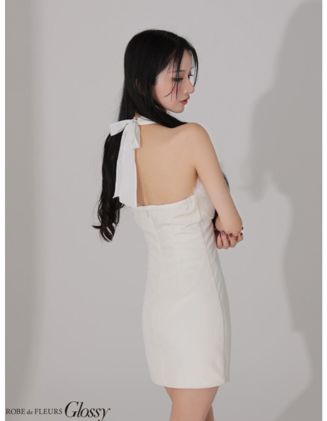 グラマラスなVカットデザインと、華やかなフェザー装飾が目を引く。