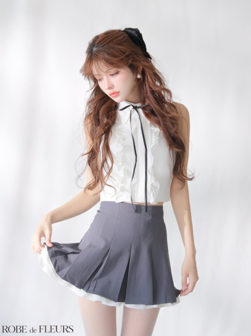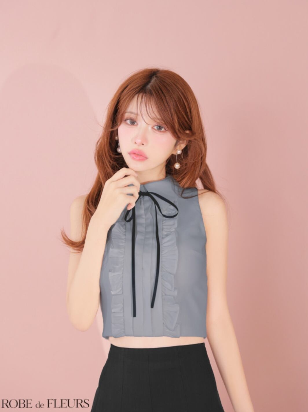 フロントのフリルがクラシカルな雰囲気漂うトップスは、リボンの取り外しも可能。